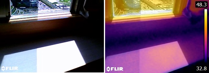 室內沒空調冷氣情況下,使用溫度顯示儀觀察,太陽光照射進入同一窗戶玻璃, 左半邊貼上JEC隔熱紙後, 可明顯看見左側有效降溫!!