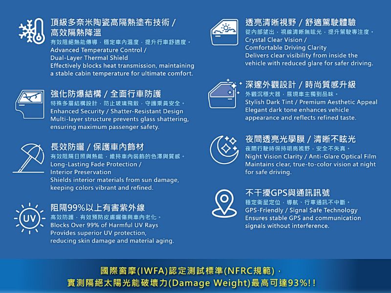 採用「頂級多奈米陶瓷高隔熱塗布技術」與光致變色技術。膜面會隨著紫外線強弱,吸收UV的多寡而改變分子結構,自動調整透光率,讓白天保持舒適涼爽的高阻隔狀態,夜晚自動恢復高透視清晰視線,全時守護行車安全。